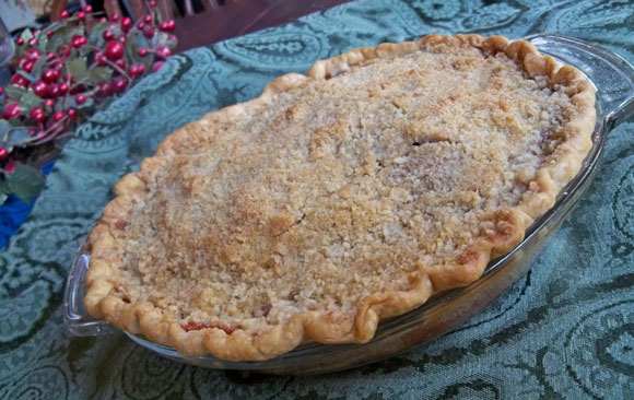 A cinnamon and apple filled pie topped with brown sugar crumb topping. Delish!