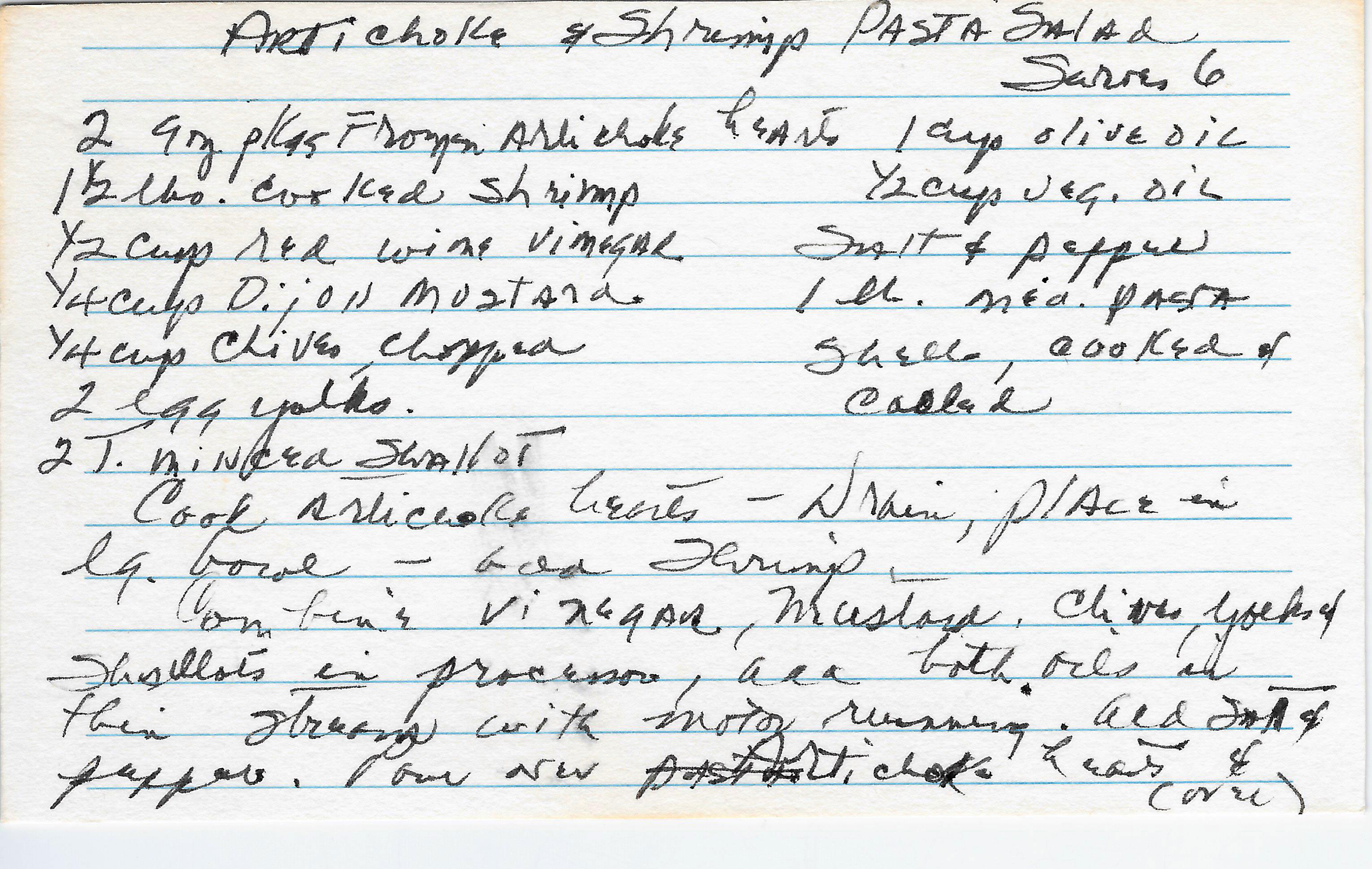 Cold pasta salad with artichokes, shrimp, and seasonings.