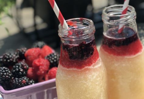 Pour frozen lemonade into serving glasses; top with a tablespoon of red raspberry syrup followed by a tablespoon of blackberry syrup.