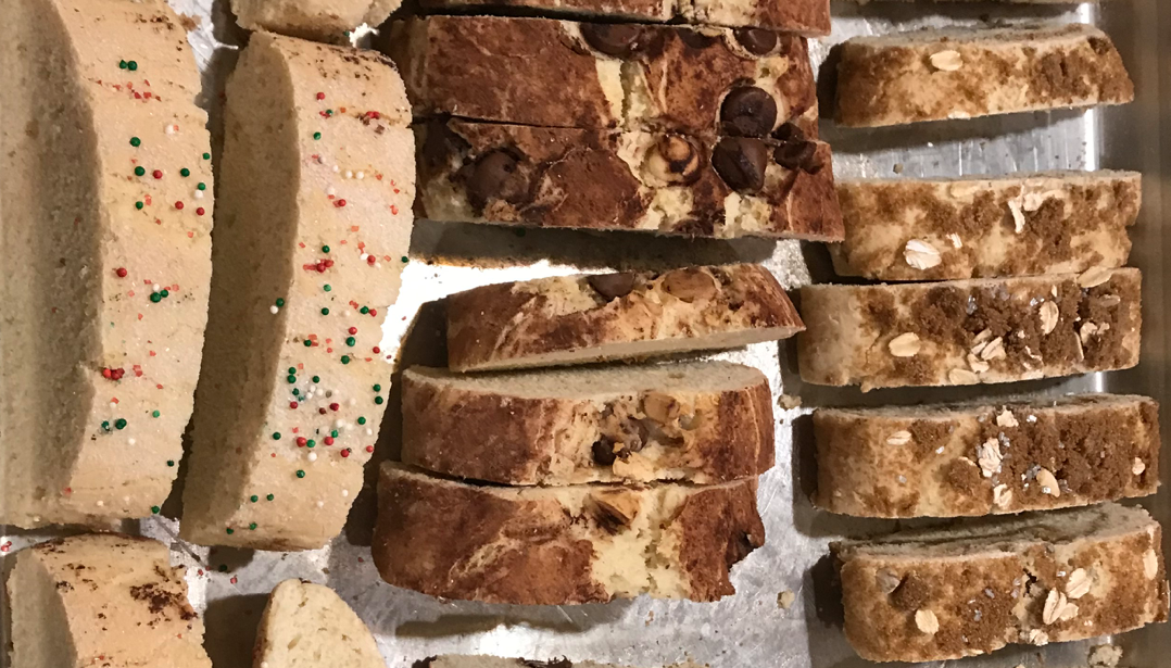 4. Once out of the oven, slightly cool then slice on an angle. You can stand the slices up and re-bake, thus called biscotti which means twice baked. You just put back in oven for 5 mins. or so. I DO NOT twice bake mine because we like them soft. Once cooled, put in container.