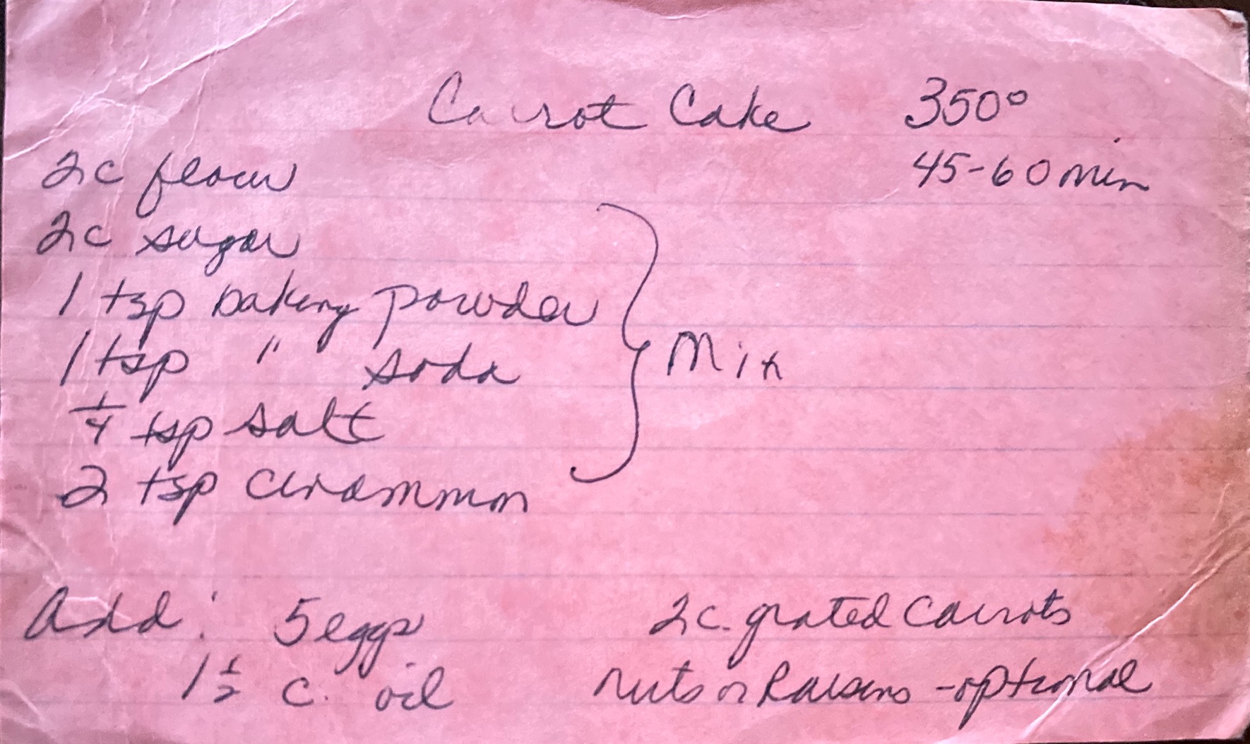 Add eggs, oil and grated carrots, mixing well. Add nuts or raisins, if desired.