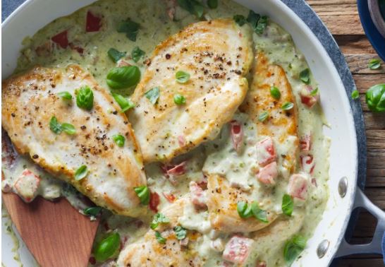Quick 20-minute dish made with chicken cutlets and tomatoes in a creamy pesto sauce; serve over zucchini noodles or pasta.