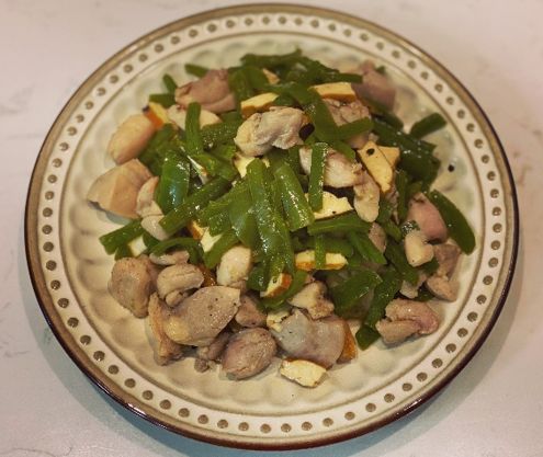 Heat the fry pan with 10ml olive oil to almost 150 degrees and cook the chicken to medium well, put green pepper and dried bean curd into the pan, sprinkle a bit salt with 2 spoons of vinegar, then cook together over medium-low heat until the chicken is well-done