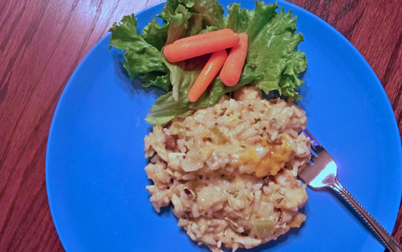A cheesy, tasty casserole using quick wild rice mix and diced chicken.