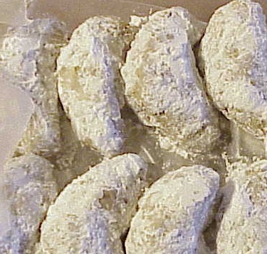 Butter cookies shaped like crescents and rolled in powdered sugar.