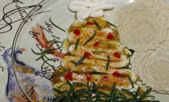 Shape cream cheese as Christmas tree and serve with jalapeno peach jelly.