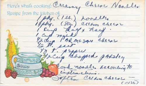 Noodles tossed in a creamy cheese sauce and topped with parsley.