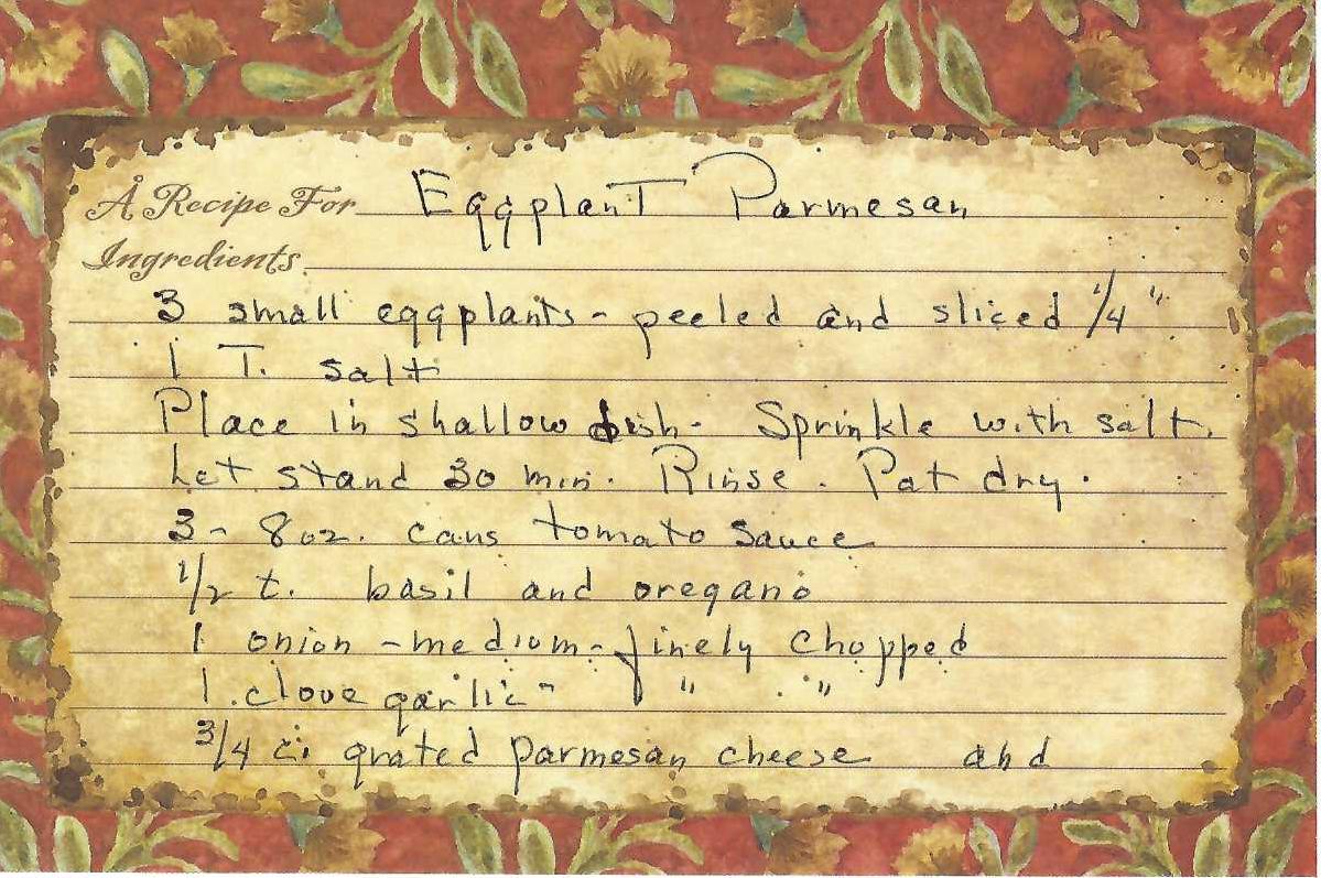 Combine tomato sauce, basil, oregano, onion and garlic in saucepan. Simmer 10 minutes. Place 1 layer of eggplant in a greased 9x13 pan. Pour 1/3rd of tomato sauce over, then 1/3rd of parmesan cheese and 1/3rd of mozzarella cheese. Repeat layering twice.