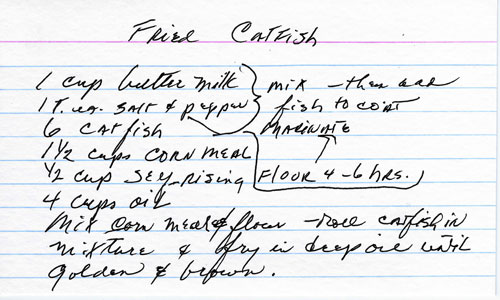 Catfish marinates in buttermilk for a few hours before being coated in cornmeal and flour and fried.
