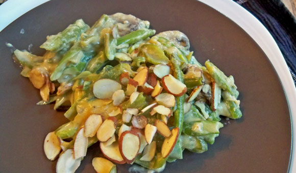 Cook green beans in salted water until tender; drain. Mix with mushrooms, sauce, and water chestnuts. Pour into a casserole dish and sprinkle with almonds. Bake 20 minutes at 375 until bubbly.
