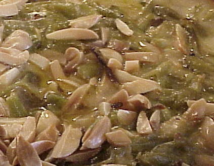 2. Thaw the green beans or put in hot water. (You do not want to cook them at this point. They will cook enough when placed in oven). Drain. Mix with mushroom sauce & water chestnuts. Pour into a buttered casserole dish & sprinkle with almonds.