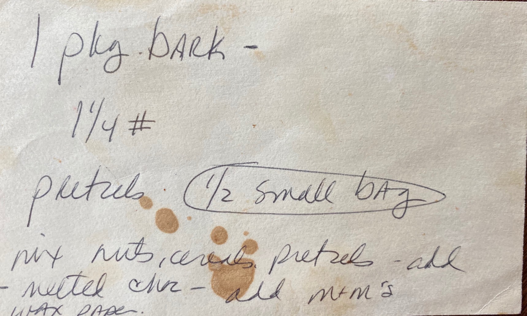 Cereal, nuts, pretzels, and M&M's tossed with melted chocolate and hardened for holiday candy treat.