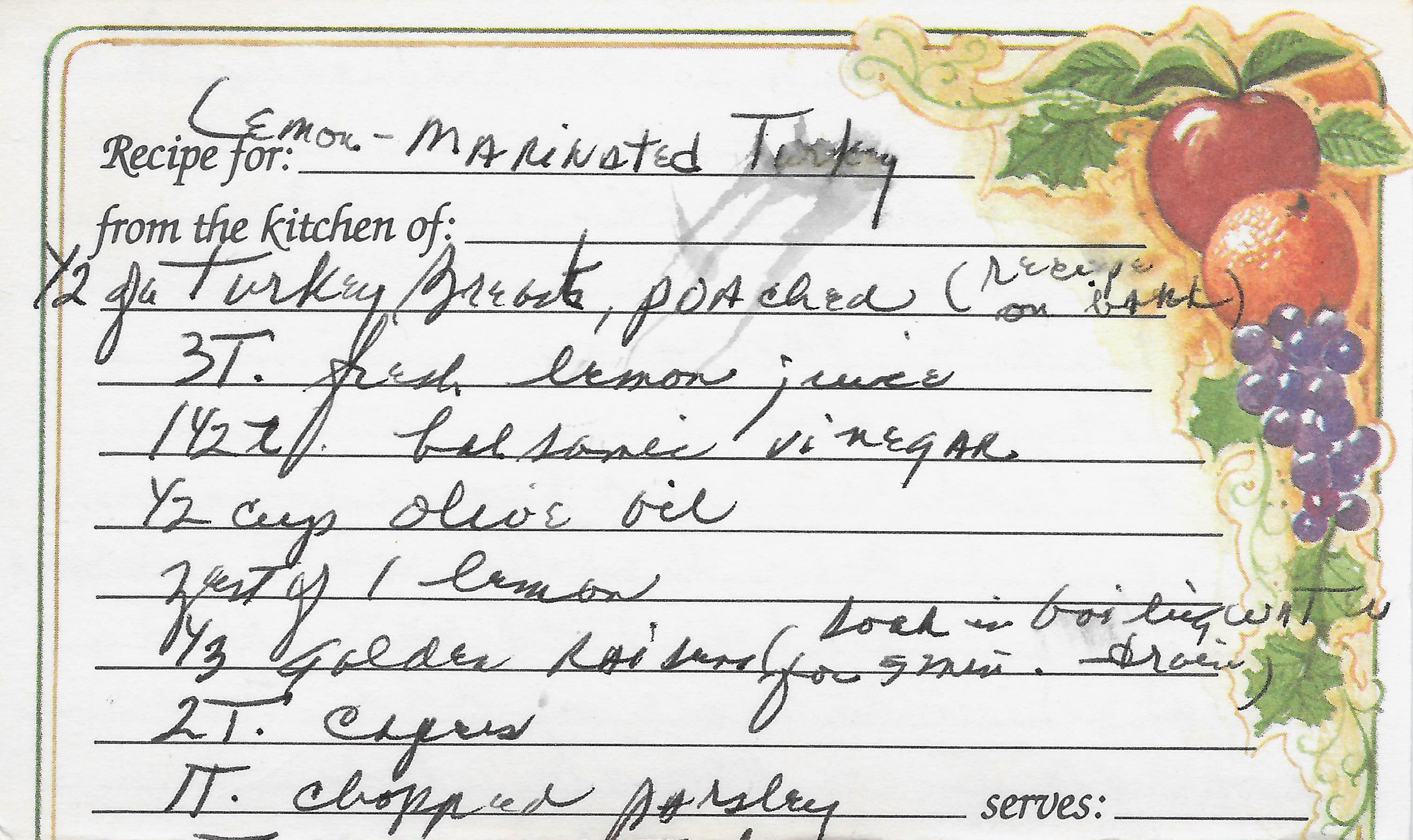 To serve: Cut turkey on diagonal; arrange slices on a platter. Stir parsley and mint into dressing and pour over turkey slices. Sprinkle with pine nuts.
