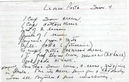 Fettuccine tossed in a sour cream and cottage cheese sauce seasoned with lemon, thyme, and Parmesan.
