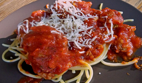 Combine beef with all other ingredients listed, except spaghetti noodles and sauce. Mix thoroughly by hand. Roll mixture into 1-1/2 inch balls (makes about 25) and place balls on baking sheet; place in freezer for 5 minutes to help balls stay together while cooking. In skillet, heat some olive oil until hot; add meatballs and cook until browned - about 5-7 minutes, turning after half that time. When meatballs are cooked most the way through, pour spaghetti sauce into skillet over meatballs, enough to cover. Reduce heat and let simmer for 10 minutes, allowing flavors to meld. Serve over cooked spaghetti noodles and sprinkle with parmesan cheese, if desired.
