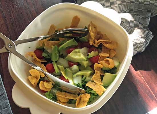 Salad greens with cucumber, tomato, avocado and French dressing with Fritos; it sounds a little corny, but the flavors are so good together!