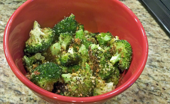 Cut broccoli florets into bite size pieces. Place broccoli into a mixing bowl and toss with the olive oil, garlic, salt and pepper, and panko bread crumbs.