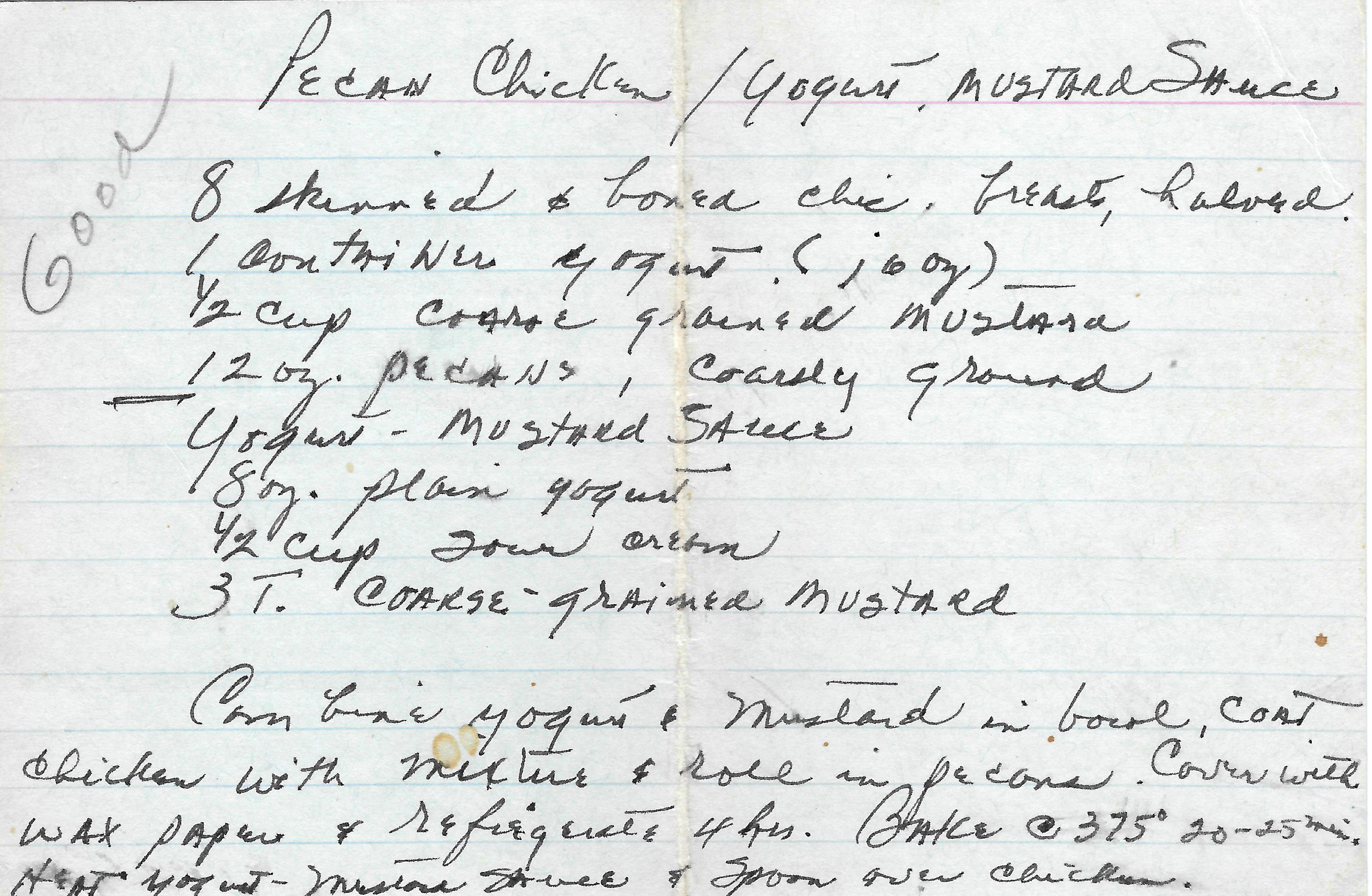 Mustard coated chicken rolled in pecans, marinated, and baked; served with a creamy yogurt mustard sauce.
