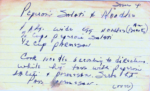 Meanwhile, cook noodles according to directions. While hot, toss with peperoni salati and Parmesan. Serve hot.