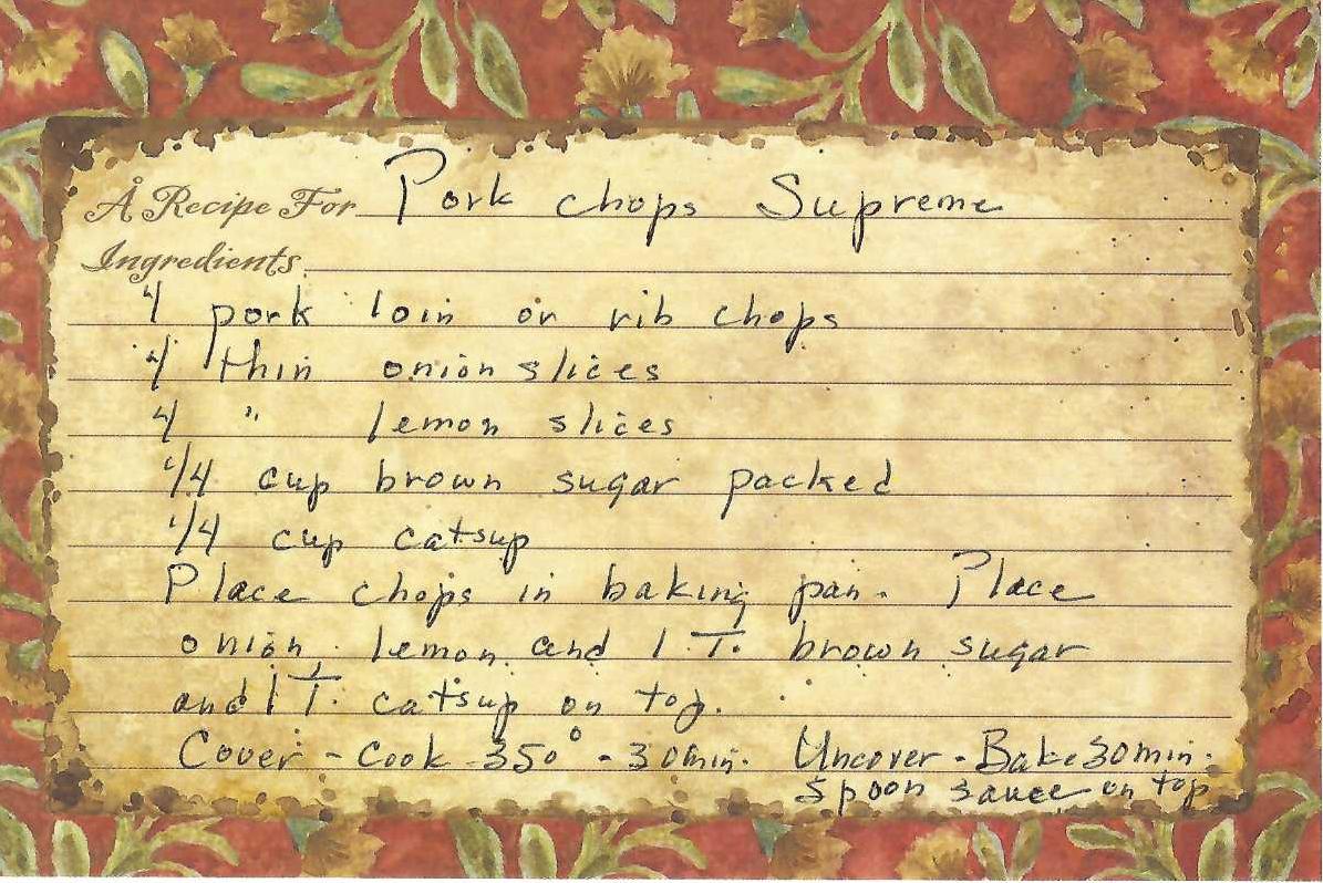 Place chops in baking pan. Place onion, lemon and 1 T. brown sugar and 1 T. catsup on top. Cover and cook for 30 minutes at 350°. Uncover and bake for 30 more minutes. Spoon sauce on top.