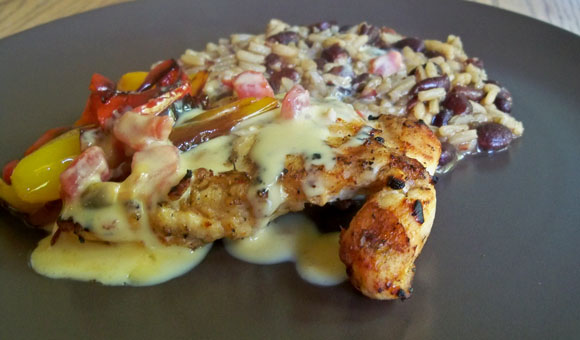 Grilled chicken served topped with queso; great on a bed of rice or with black beans and rice.