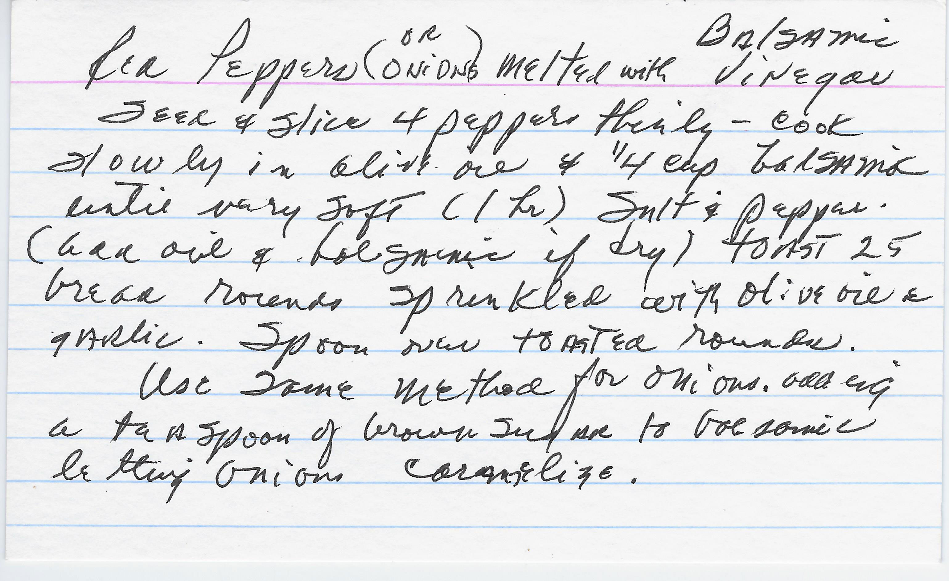 Gently simmered peppers or onions with balsamic vinegar served over toasted bread rounds.