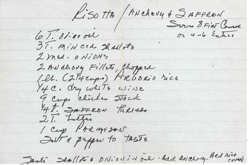Saute shallots and onion in oil. Add anchovy. Add rice and brown; stir in wine.