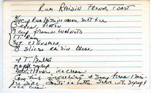 Raisin bread soaked in melted rum raisin ice cream with seasonings, cooked up like french toast, and topped with syrup and ice cream.