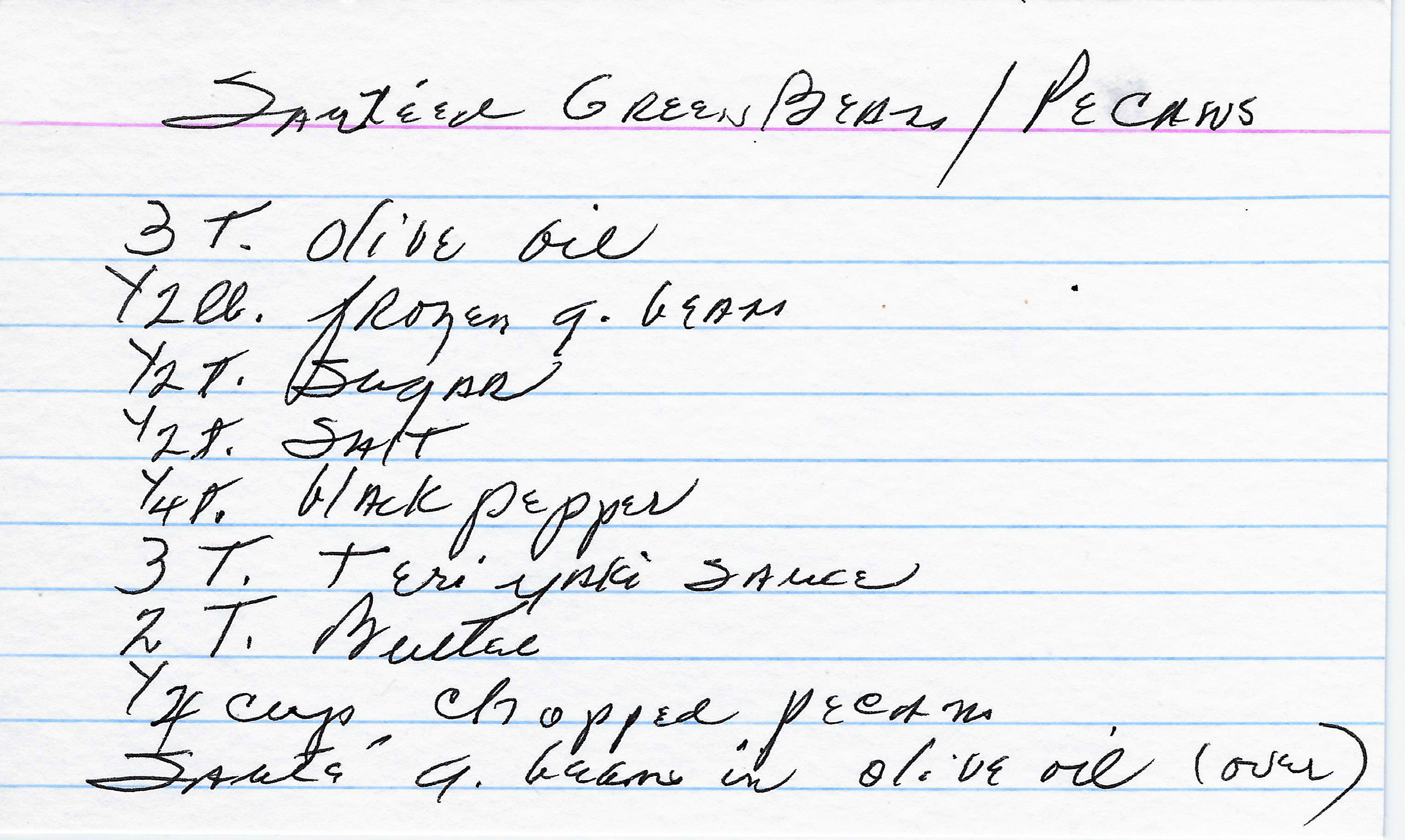 Frozen green beans with teriyaki sauce and seasonings, tossed with butter and pecans.
