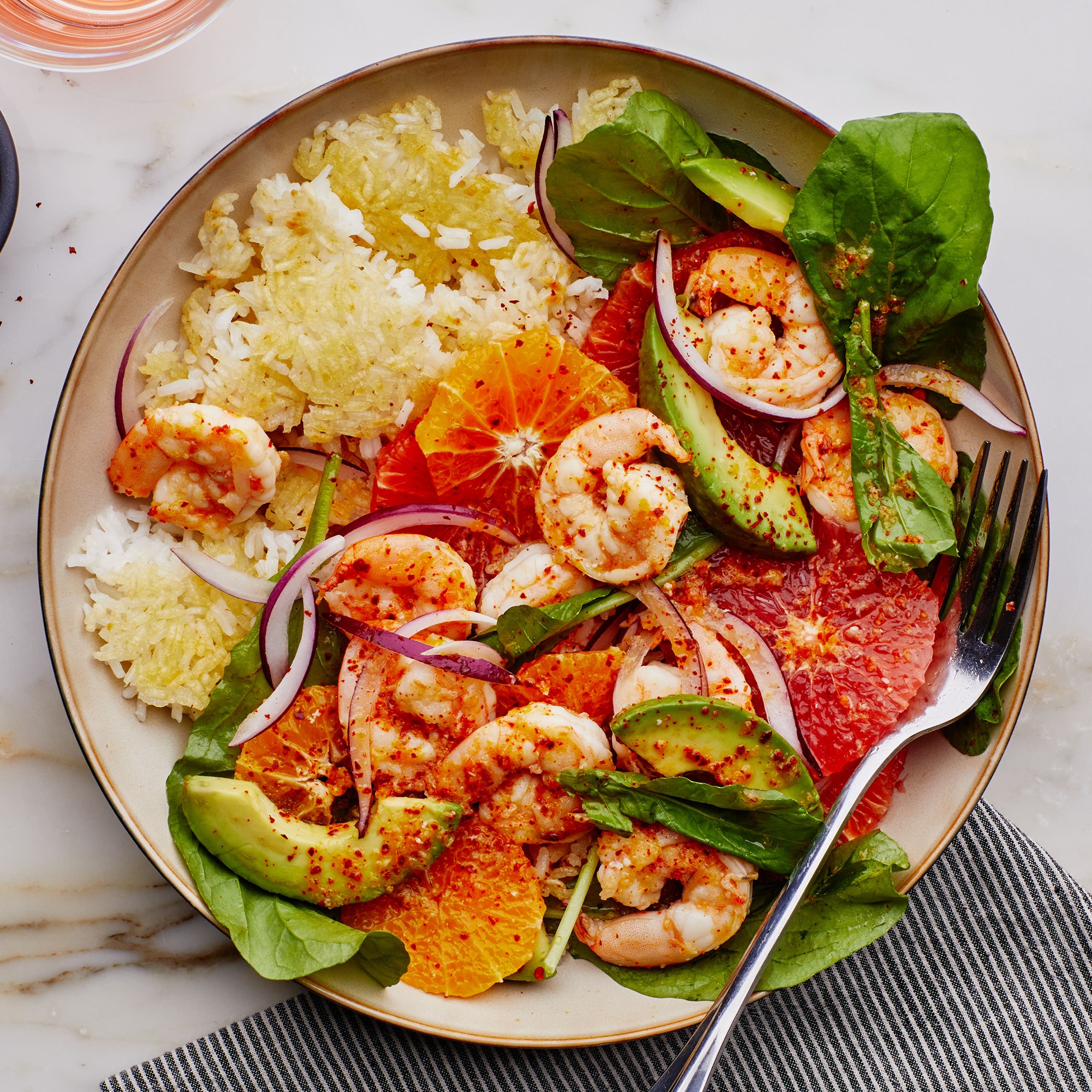 Add avocado, onion, arugula, and reserved citrus rounds to bowl with shrimp and season with salt; toss well. Spoon over rice; drizzle any remaining dressing on top. Sprinkle mild chile flakes over.