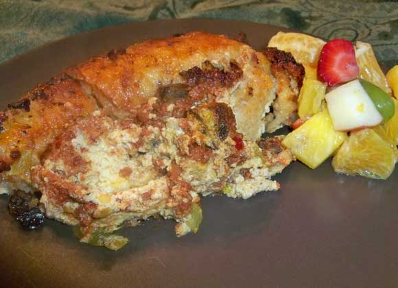Separate eggs; beat egg yolks, then whip egg whites until foamy. Fold egg whites into yolks along with salt, onion, red chile powder, black pepper, chopped mushrooms, and green chile. Add cream or evaporated milk to mixture and blend well.
