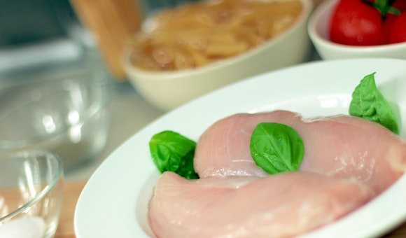 Halve the breasts with a knife and flatten them with a meat mallet.