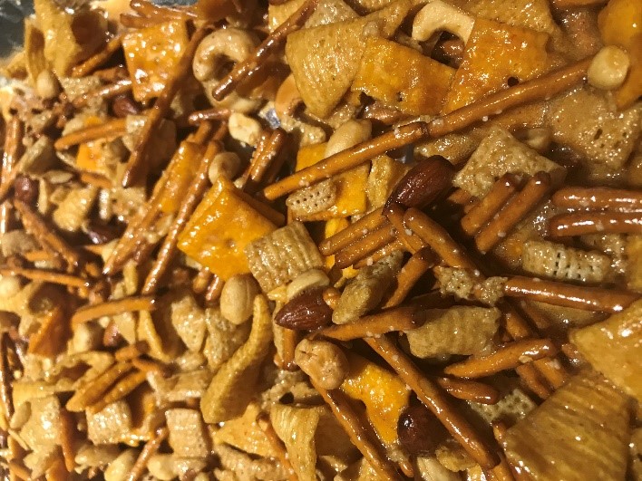 Spicy smoked snack mix made with pretzels, Cheezits, Chex cereal and a spicy sauce.