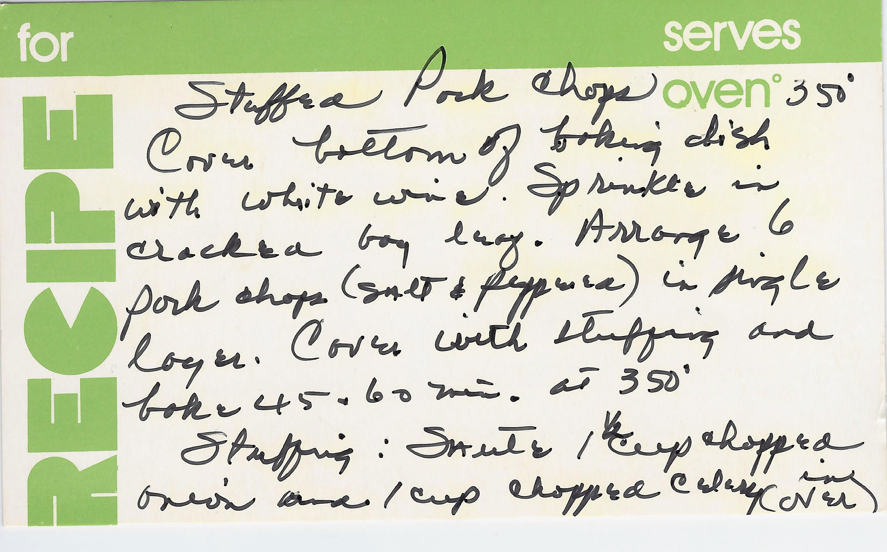 Cover bottom of baking dish with white wine. Sprinkle in cracked bay leaf. Arrange pork chops (seasoned with salt and pepper) in single layer. Cover with stuffing and bake 45 to 60 minutes at 350 degrees F.
