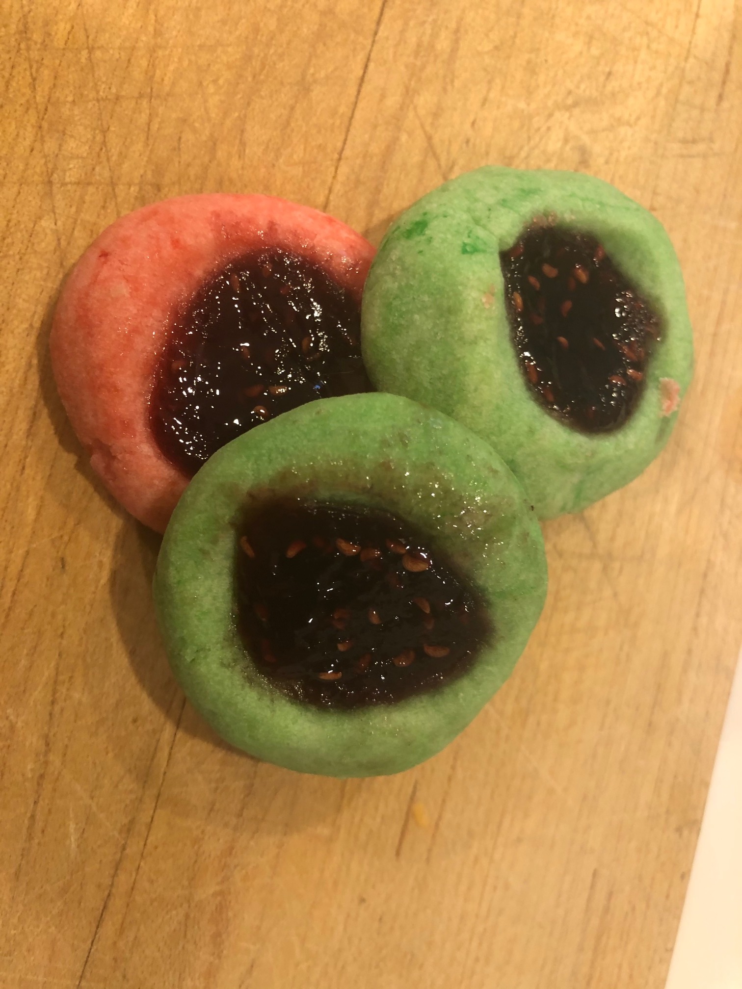 Roll into small balls and press thumb into center. Fill thumb print indentation with jam.