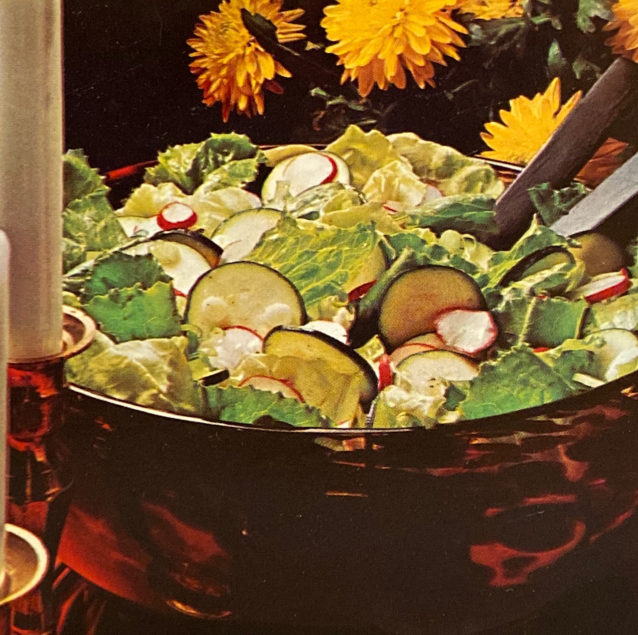 Salad greens tossed with zucchini, radishes and onion, topped with garlic dressing.