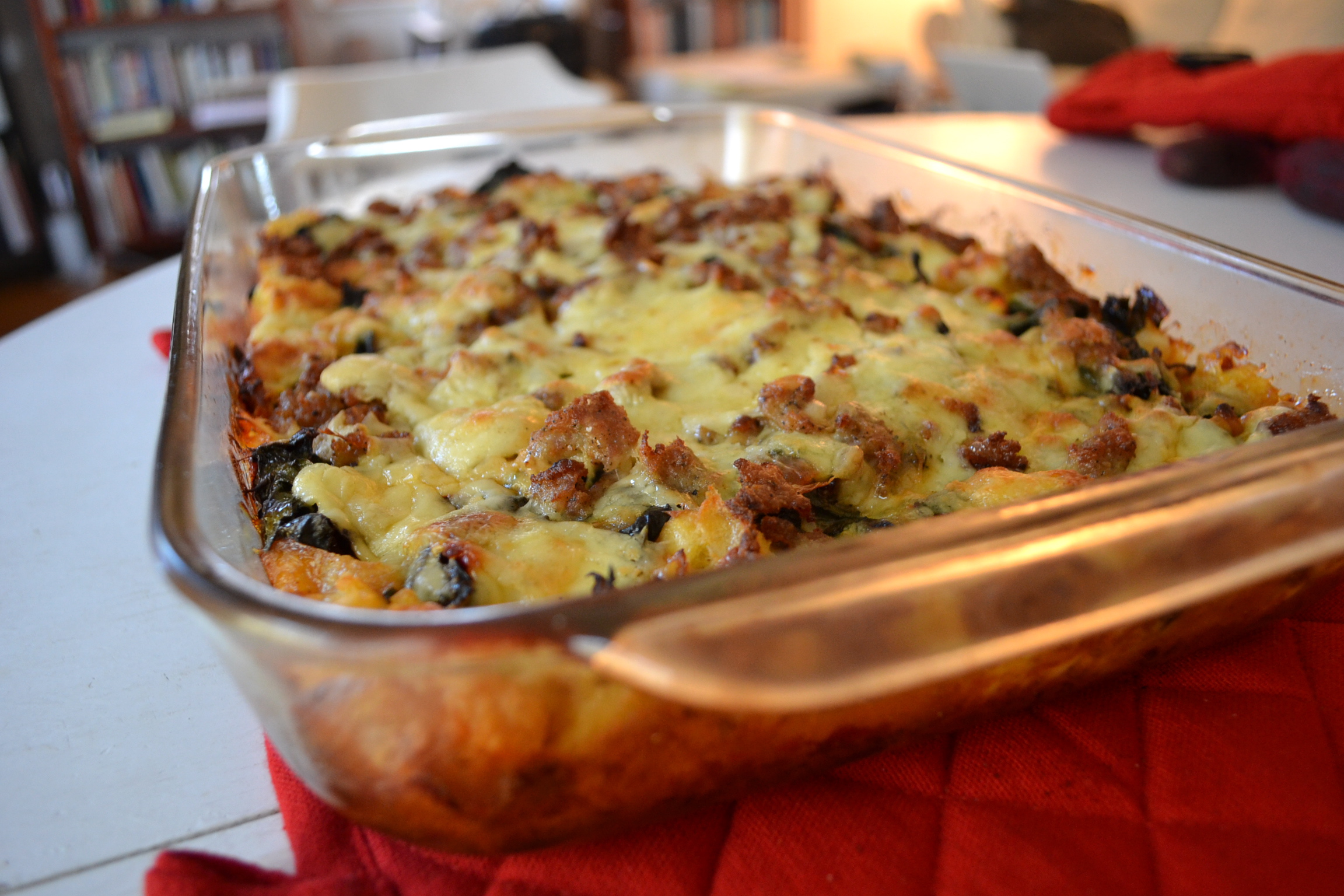 In a 9x13 Pan, spray with spray oil. Cover bottom of pain with croissants or biscuits. Brown sausage and drain. Crumble over top of bread in pan. Add mushrooms (if desired). Sprinkle all over with cheese. Combine eggs nd milk in a bowl and pour over top of cheese. Bake @ 350 for 45 minutes.
