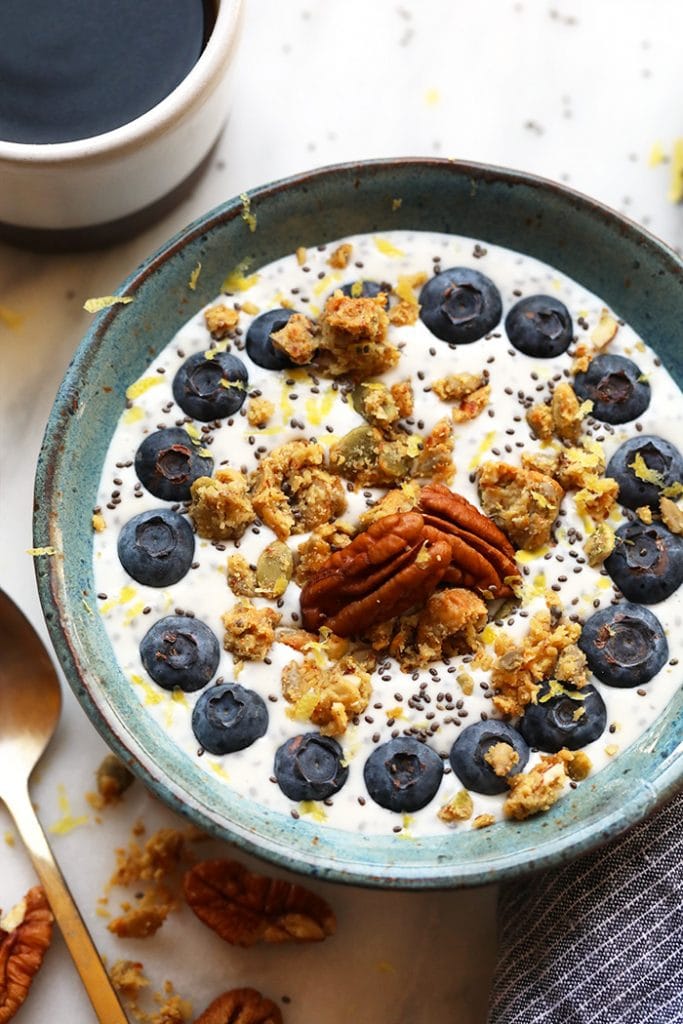 In a large bowl or Tupperware, mix together all ingredients. Let sit in the fridge for at least 4 hours or overnight. Serve with nutrient-packed toppings such as WholeMe, blueberries, pecans, chia seeds, and lemon zest.