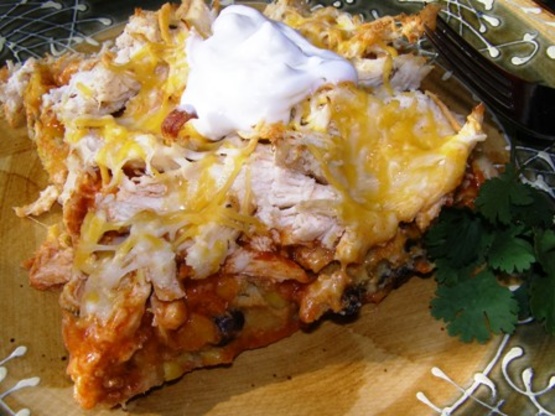 Pour mixture into prepared baking dish and bake for 15 minutes or until just set. Pierce entire surface liberally with a fork; pour enchilada sauce over the top.