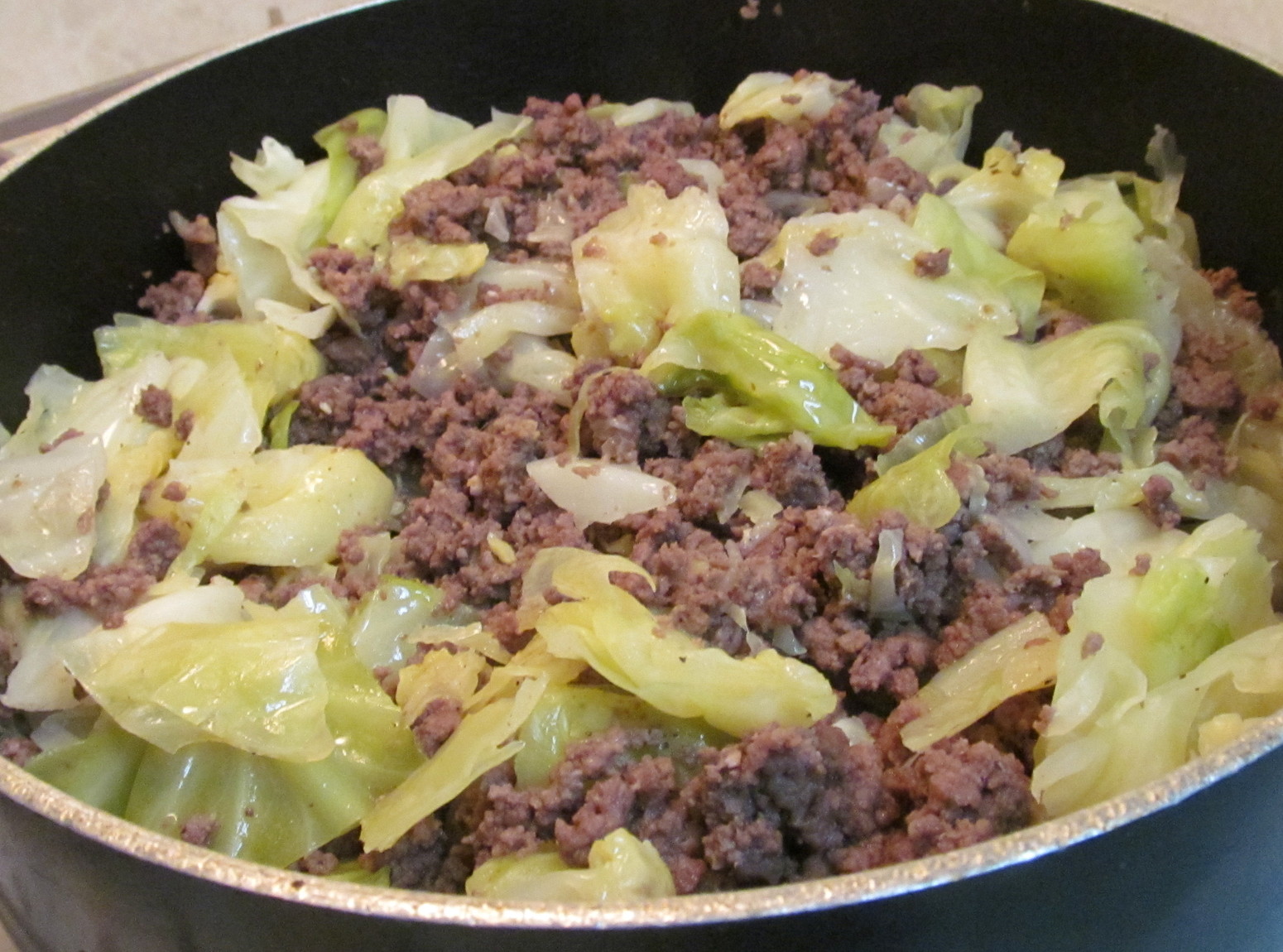Slice cabbage and boil it. While boiling, brown hamburger and onions, drain. Drain Cabbage and mix with Hamburger and onion mixture. Add tomato, toss!