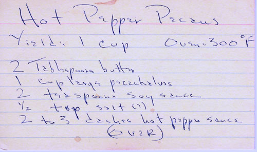 Roasted pecans seasoned with soy sauce and hot pepper sauce.