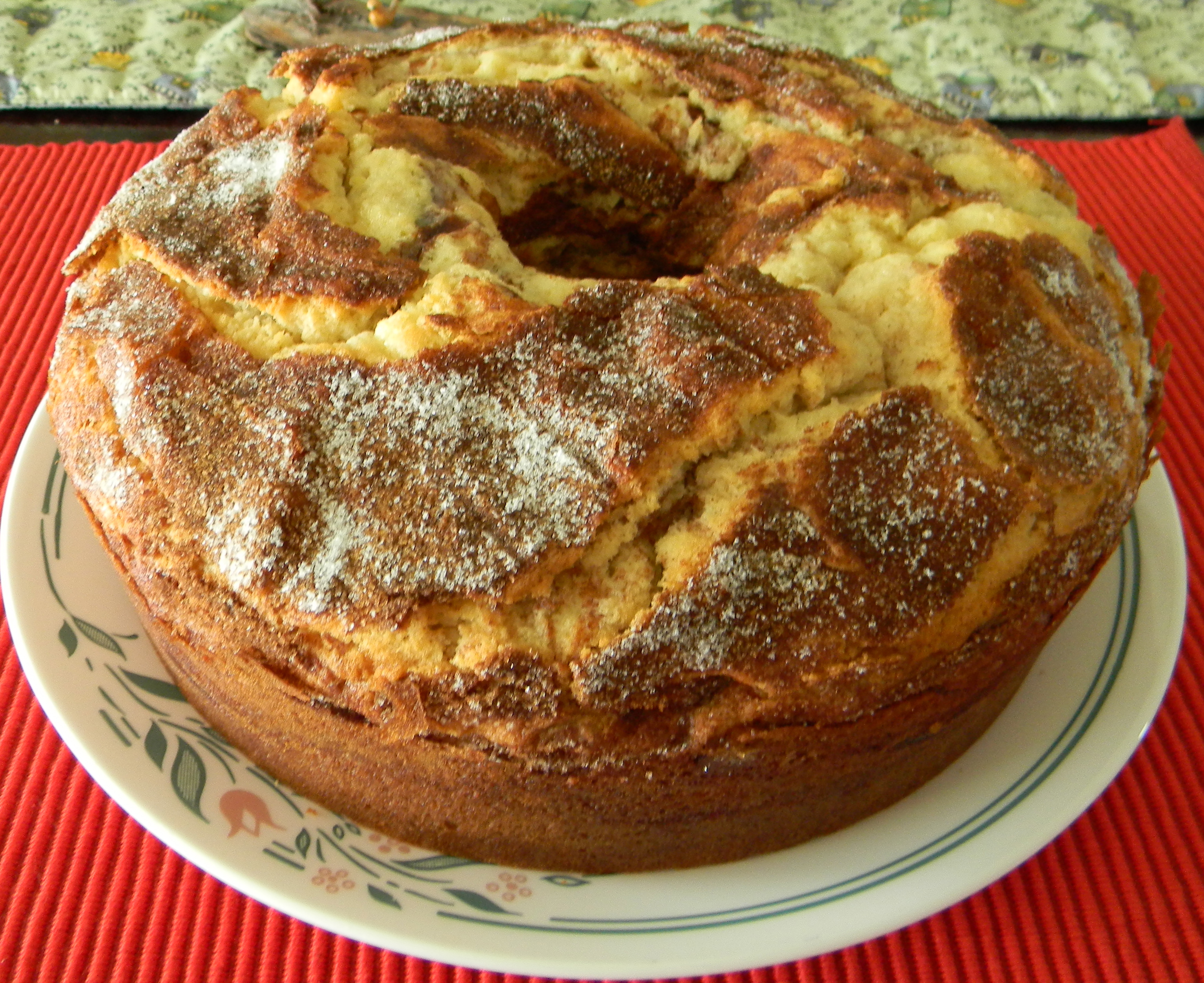 Grease and flour 10” tube pan. Pour 1/2 of the batter into the pan, and then sprinkle with cinnamon and sugar. Pour the rest of the batter on top and sprinkle with cinnamon and sugar again.