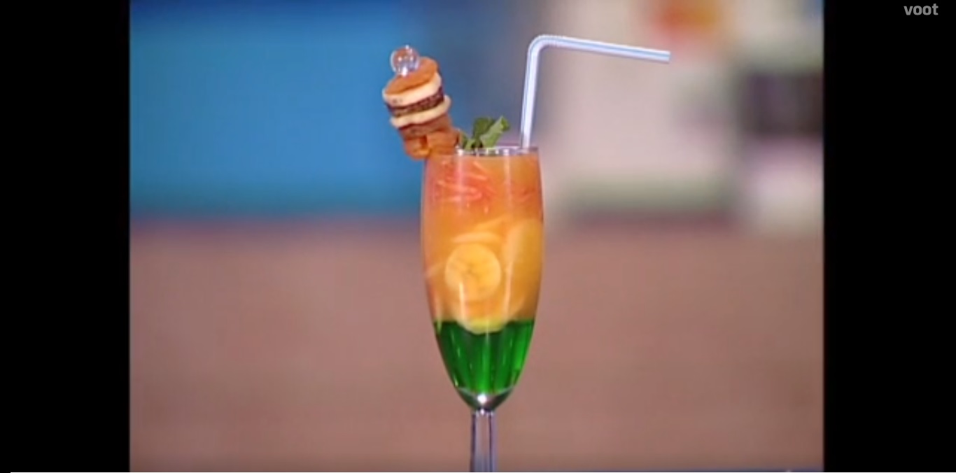 In a glass, add khas syrup, orange juice (by spoon so won't mix), banana slices, grated apple and mint.