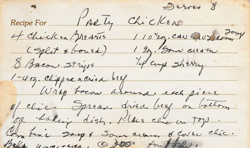 Bacon-wrapped chicken breasts baked over dried beef in a creamy mushroom sherry sauce.
