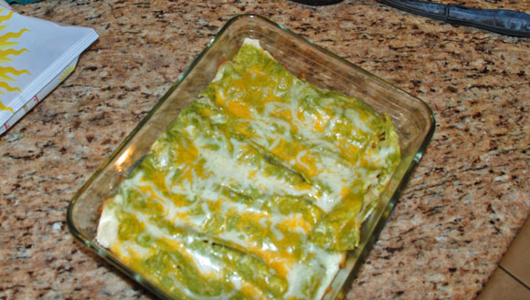5. Place some of the chicken mixture into the center of each tortilla, roll tightly, then place in baking dish (sprayed with cooking spray to prevent sticking) seam side down. Repeat with remaining tortillas. Spoon remaining sauce over top of enchiladas and sprinkle with remaining cheese.