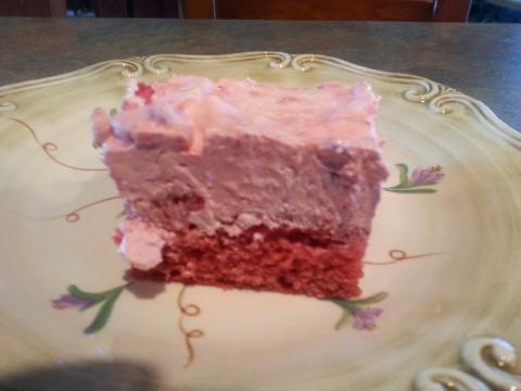 White cake mix with frozen raspberries and raspberry jell-o; topped with Cool Whip.
