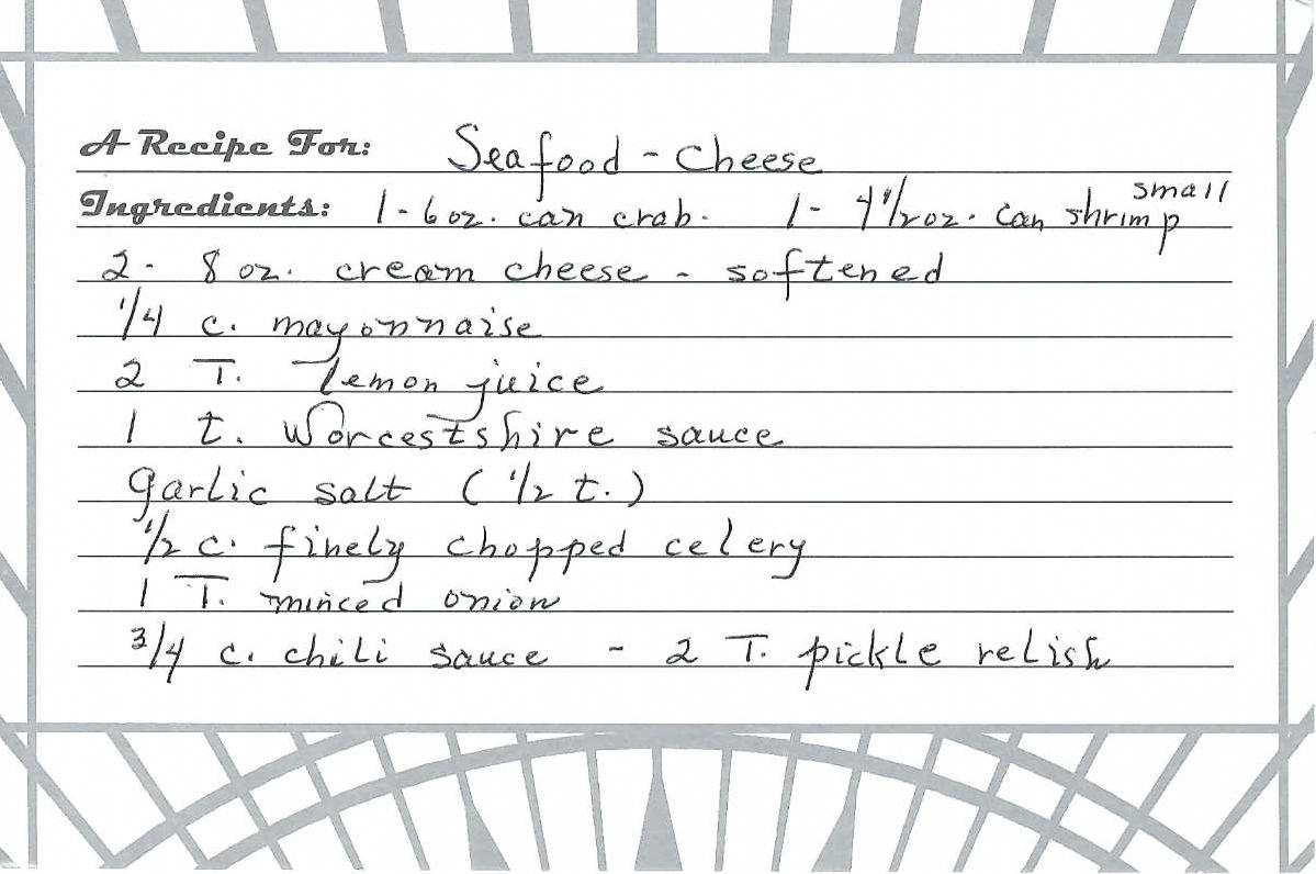 Mix cheese with other ingredients. Add seafood last. Chill.