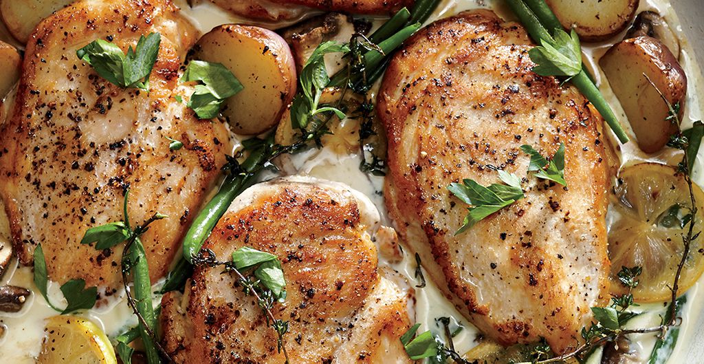 One skillet dish with chicken, potatoes, carrots and green beans in a creamy sauce (optional).