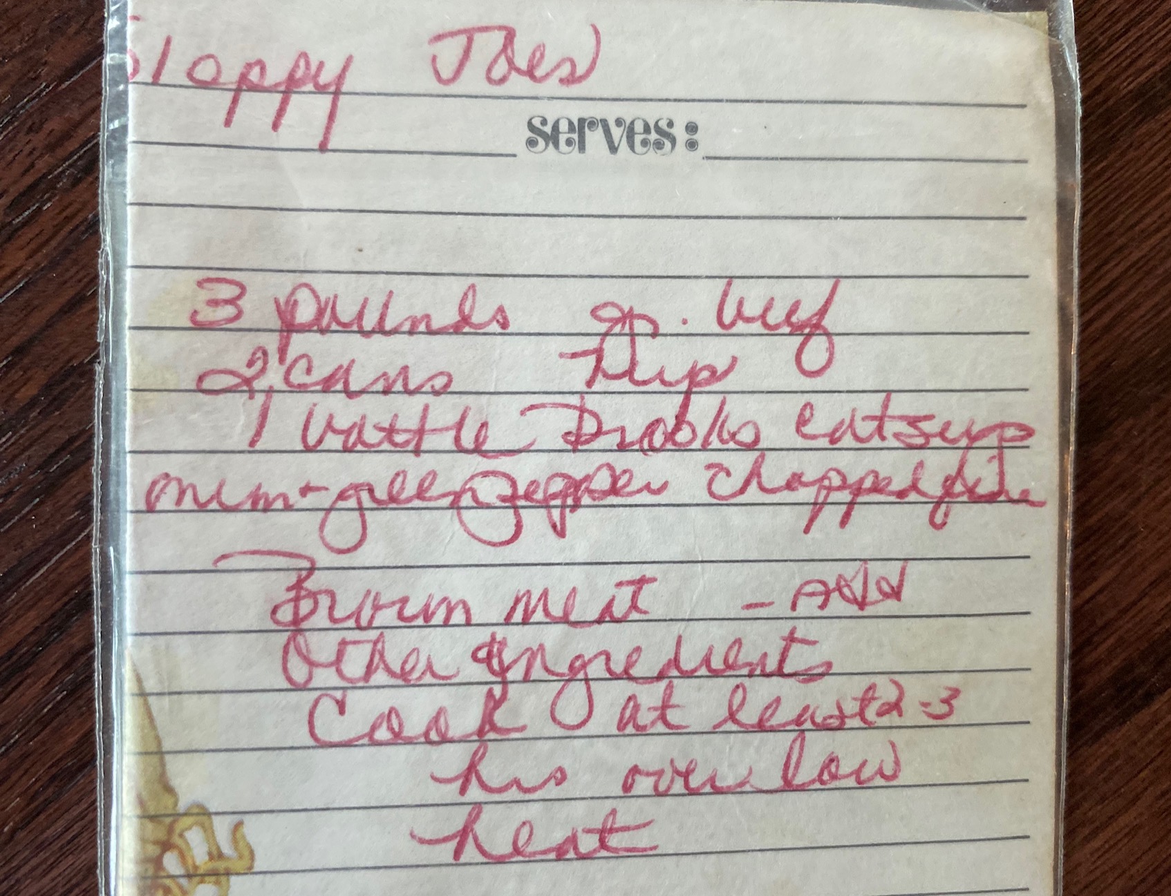 Ground beef simmered with catsup, 7up, onions and peppers.