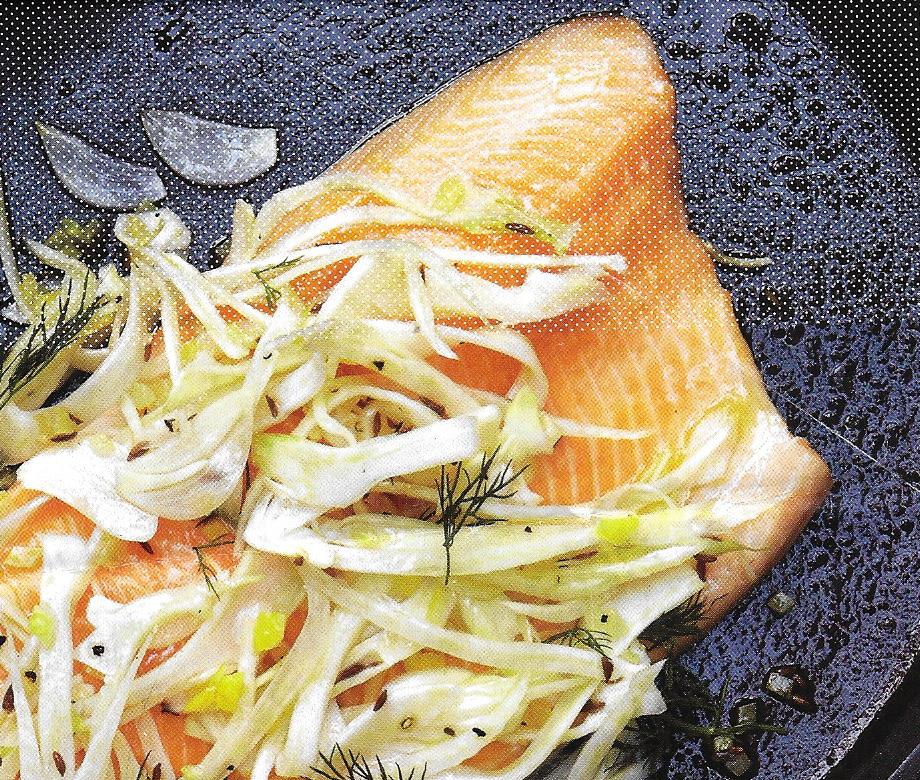 Use char, salmon or trout in this low-stress recipe of roasted fish topped with a crunchy pickled fennel salad and dill.